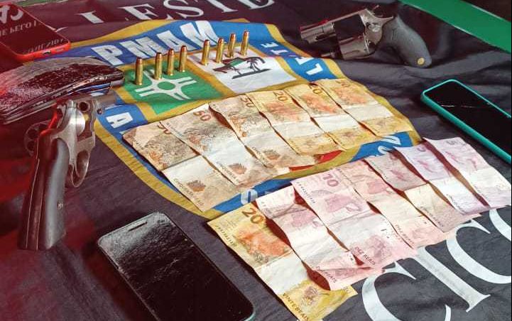 Com eles foi apreendido duas armas, revólver calibre 38, oito munições intactas, quatro aparelhos celulares, uma motocicleta preta de placa QZJ1G83 e o R$ 275 reais em espécie.