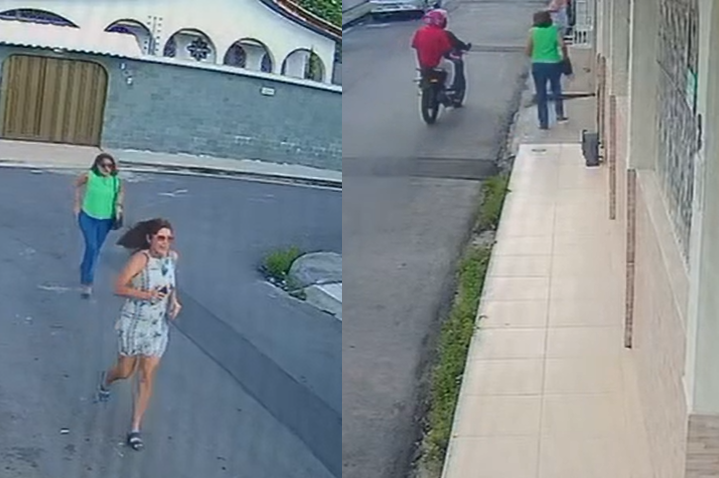 Duas mulheres que aguardavam transporte por aplicativo, por volta das 16h, se desesperaram ao ver a dupla e correm. Elas vão em direção de casa, mas eles conseguem alcança-las.