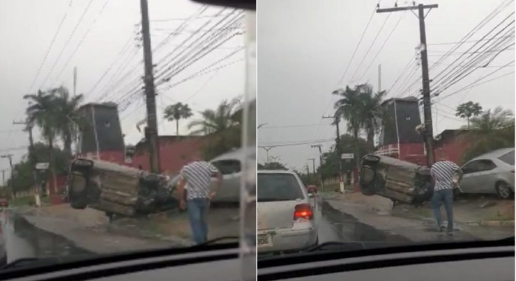 A condutora do Etios precisou pular do carro ainda inclinado, mas não sofreu nenhum ferimento. As circunstâncias e responsabilidades do acidente serão investigadas.