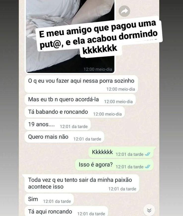 Tudo isso, porque a acompanhante contratada pelo rapaz simplesmente dormiu na hora H. Irritado com a situação, o jovem trocou mensagens com uma amiga, se lamentando pelo ocorrido.