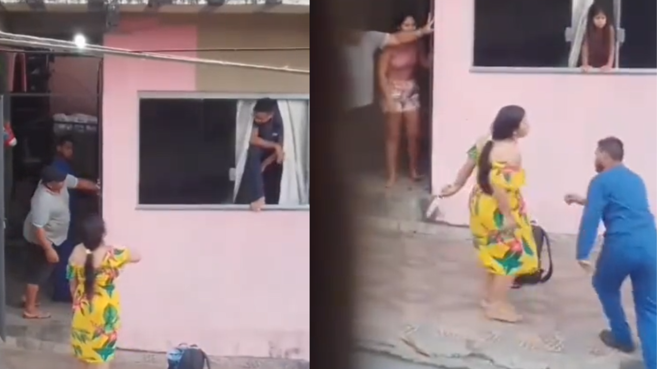 A mulher trancou a porta e não deixou o esposo entrar, isso porque ele está com uma faca e o novo dono do seu coração bandido está lá dentro acovardado.