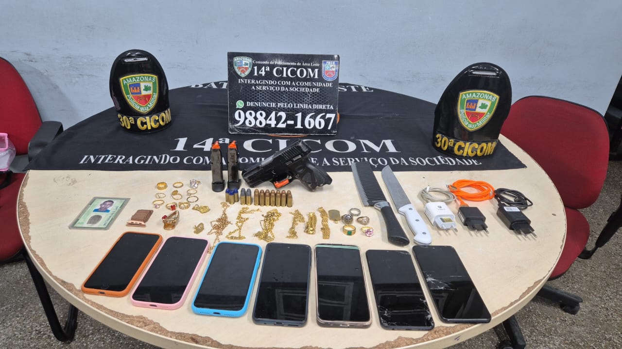 Totalizando foram apreendidos uma pistola Taurus G2C, calibre 40, preta, com três carregadores; 21 munições calibre 40 CBC (não deflagradas); seis cordões dourados; 15 anéis dourados; sete aparelhos celulares; duas facas; três carregadores de celular.