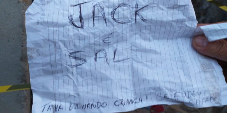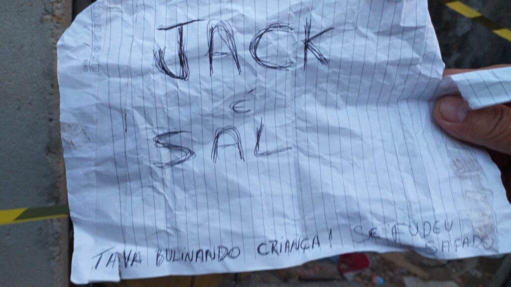 Segundo informações preliminares, Manoel Diones foi morto por traficantes da área, após tentar violentar sexualmente uma criança. Os criminosos deixaram um bilhete em cima do corpo da vítima. “Jack é sal. Tava bulinando criança. Se f*deu, safado”, dizia o bilhete.