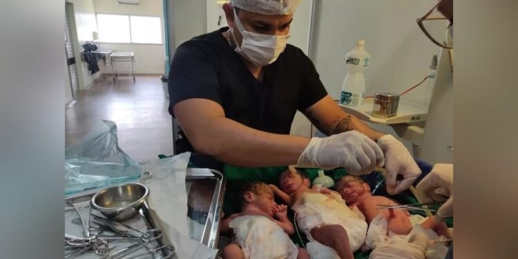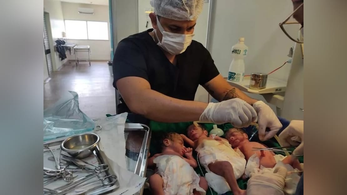 “Essa paciente chegou em trabalho de parto prematuro. Ela estava no oitavo mês de gestação. Todo mundo esperava que era uma gestação de gêmeos. Teve uma ultrassom que um colega fez indicando que eram apenas duas crianças. Para a surpresa de toda a equipe e até mesmo para a mãe, na verdade não eram duas. Eram três”, disse o médico.