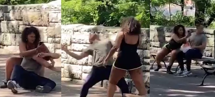 A mulher sair correndo com o telefone na mão, as pessoas que estão no parque que não foi identificado, olham pasmas para a cena hilária. O homem após a situação passa bem.
