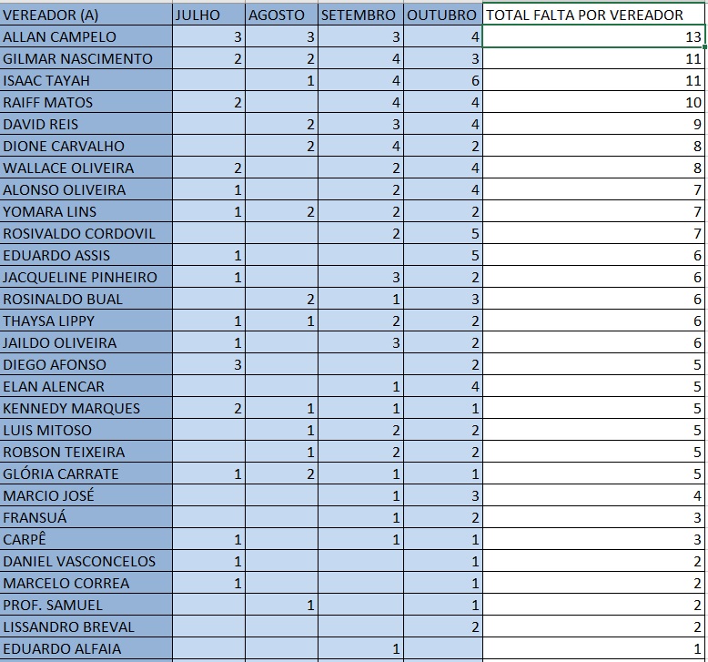 Allan Campelo, Gilmar Nascimento, Issac Tayah e Raiff Mattos são os campeões das faltas. Com salário de R$ 18 mil na conta todo mês, nem de longe os parlamentares cumprem o regime 6 x 1 que muitos políticos criticam por ser um risco à Economia e à produtividade.