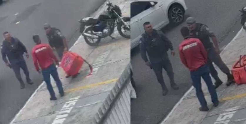O motoboy foi abordado em frente a um condomínio residencial no bairro Parque das Laranjeiras, Zona Centro-Sul de Manaus, neste domingo (25). Os PMs gritam e humilham o rapaz, que teve a CNH pega e rasgada sem que ele tivesse feito nada.