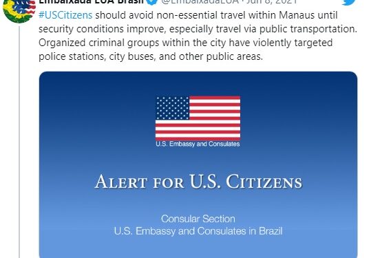 “Cidadãos americanos devem evitar viagens não essenciais para Manaus até que a condições de segurança melhorem, especialmente viagens via transportes públicos. Grupos criminosos organizados da cidade têm violentamente atacado delegacias de polícia, ônibus, e outras áreas públicas”, diz o comunicado.
