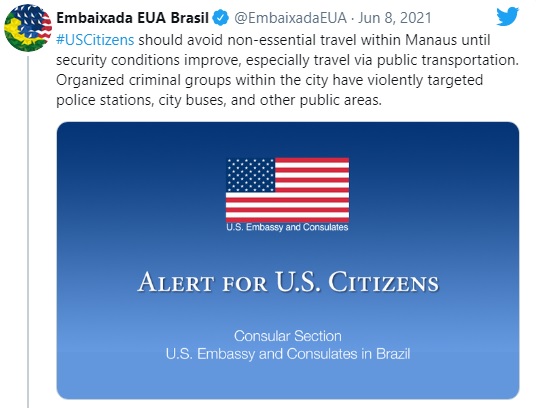 “Cidadãos americanos devem evitar viagens não essenciais para Manaus até que a condições de segurança melhorem, especialmente viagens via transportes públicos. Grupos criminosos organizados da cidade têm violentamente atacado delegacias de polícia, ônibus, e outras áreas públicas”, diz o comunicado.