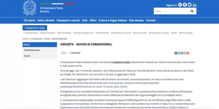 ITÁLIA | A Embaixada da Itália fez um apelo para que todos os seus cidadãos que estejam no Brasil por motivos de breve duração retornem para o país europeu “o quanto antes”. Esta semana, a embaixada da Alemanha fez uma recomendação semelhante a seus cidadãos.