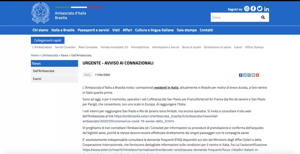 ITÁLIA | A Embaixada da Itália fez um apelo para que todos os seus cidadãos que estejam no Brasil por motivos de breve duração retornem para o país europeu “o quanto antes”. Esta semana, a embaixada da Alemanha fez uma recomendação semelhante a seus cidadãos.