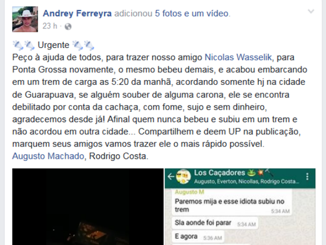 Ao chegar em Guarapuava, quase cinco horas depois, Nicolas mandou uma mensagem para os amigos, perguntando se alguém poderia ir buscá-lo. “Foi, então, que fiz o post para tentar ajudar porque eu não podia ir até lá, tinha que trabalhar”, relata.