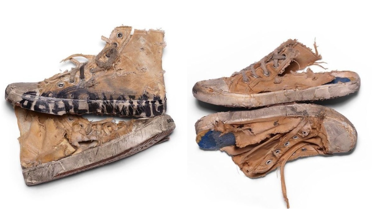 O tecido do tênis vem todo rasgado e com aspecto de sujo. Em sua sola, o nome da grife, “Balenciaga”, aparece de forma grafitada. Na descrição do produto no site da marca, os fabricantes dão destaque ao “algodão e borracha completamente destruídos” e os “rasgos em todo o tecido”.