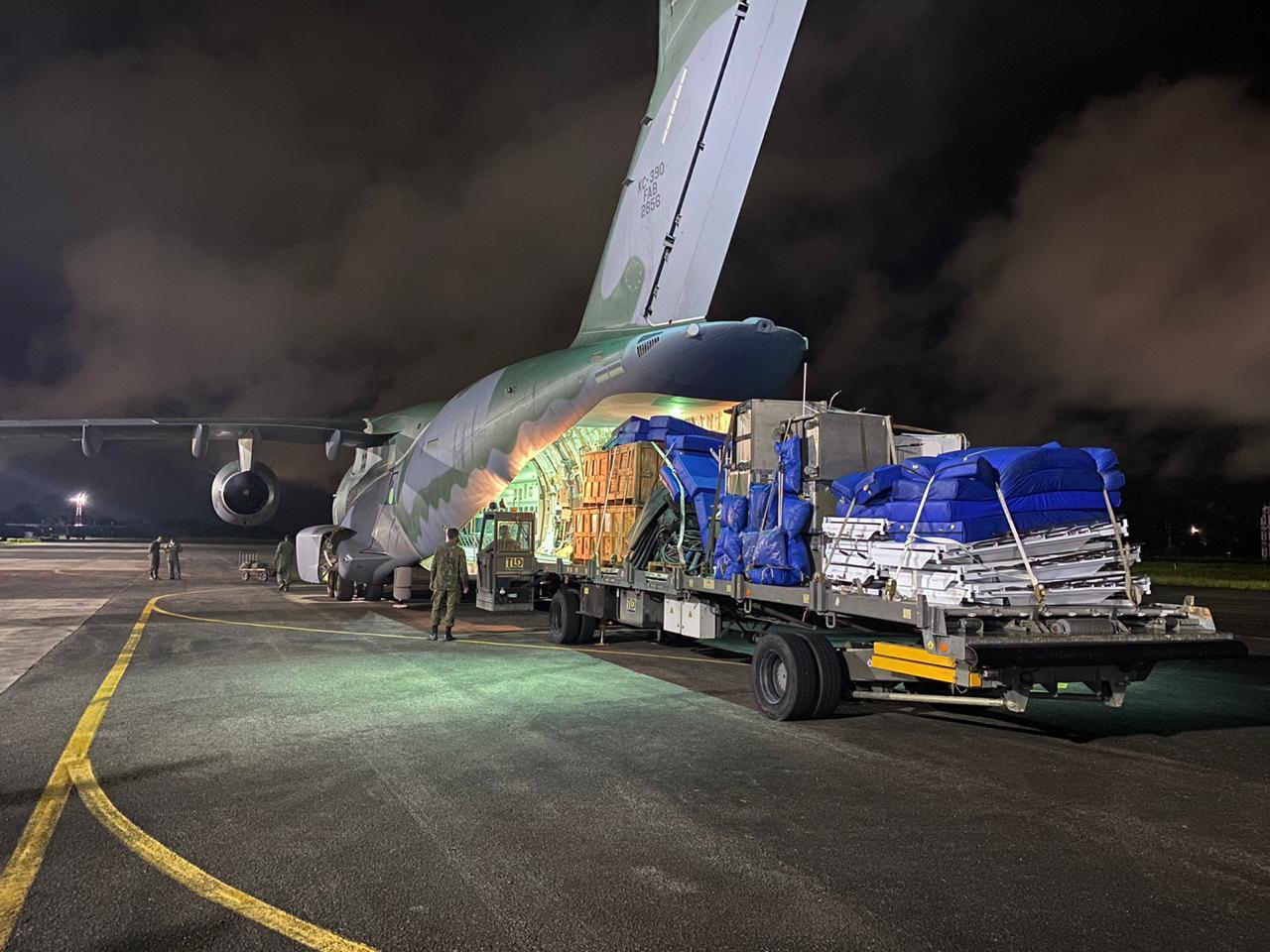 Os primeiros contêineres descarregados na quinta-feira continham tendas, leitos, macas, equipamentos hospitalares e instrumentos para montagem de uma miniusina de oxigênio para atender a nova estrutura.