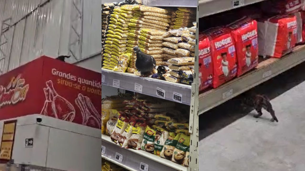 Nas imagens, o homem filma gatos passando pelos fardos de alimentos e ainda diz que registrou um pombo dentro do estabelecimento.