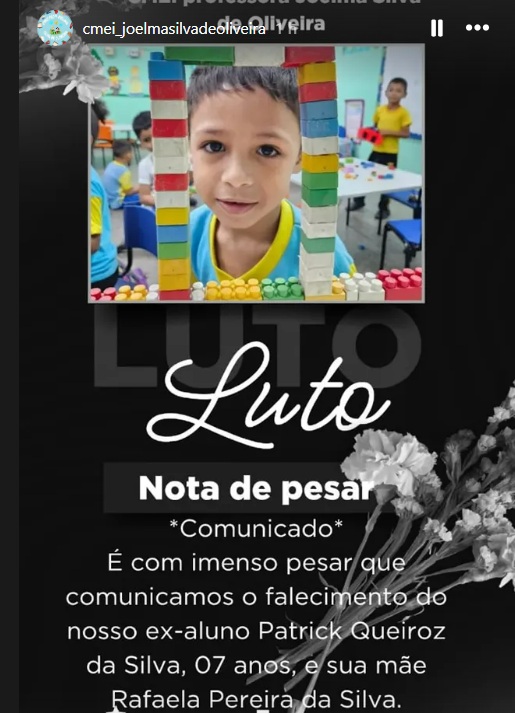 MANAUS – A escola Professora Joelma Silva de Oliveira lamentou a morte do pequeno Patrick Queiroz da Silva, de 7 anos, e se solidarizou com a família. A mãe, Rafaela Pereira da Silva, de 31 anos, morreu ao lado do filho, os dois abraçados, na casa da rua Beco Sucupira, bairro Nossa Senhora das Graças, Zona Centro-Sul de Manaus.