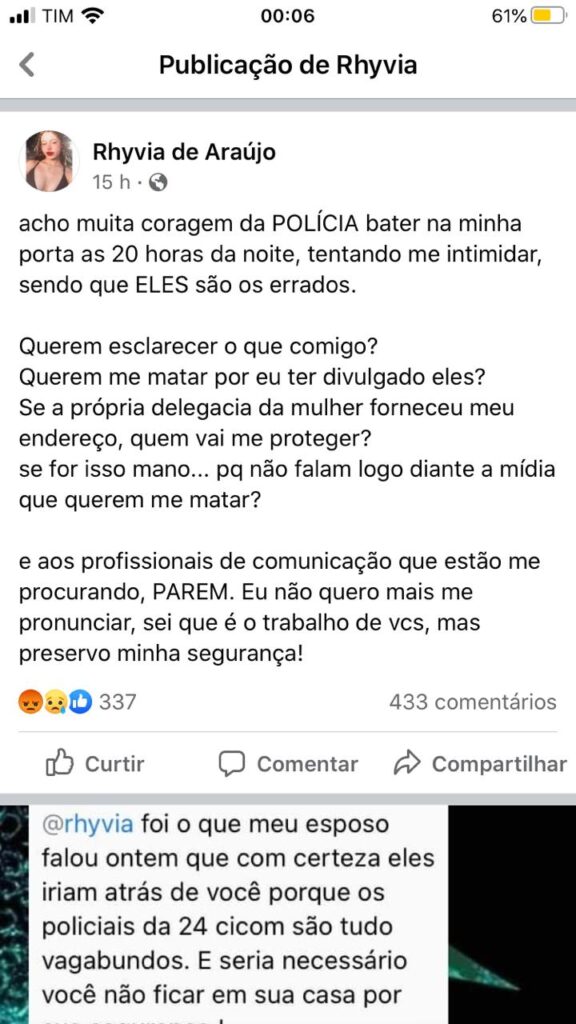 “Acho muita coragem da polícia bater na minha porta às 20h, tentando me intimidar, sendo que ELES são os errados. Querem esclarecer o que comigo? Querem me matar por eu ter divulgado eles? Se a própria delegacia da mulher forneceu meu endereço, quem vai me proteger? Se for isso, por que não falam logo diante a mídia que querem me matar?”, desabafou a universitária.