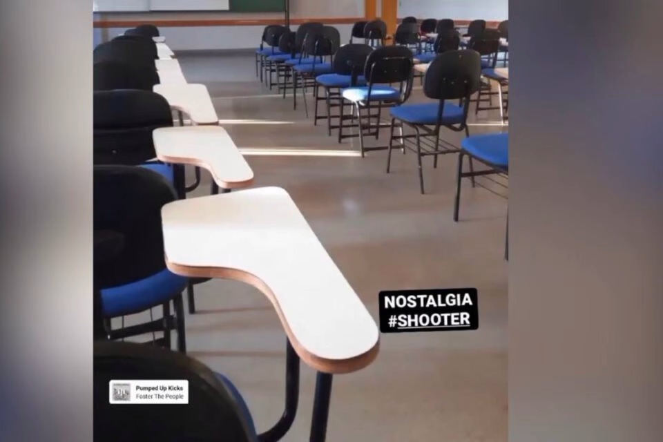 A imagem foi postada nas redes sociais e mostrava uma sala de aula da PUC-GO vazia. O aluno parecia ser o único no local. Na legenda, ele escreveu: “Nostalgia #SHOOTER”, que em tradução livre significa ‘atiradores’.