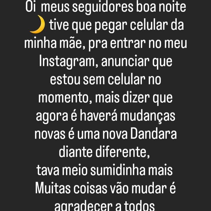Dandara estava sumida das redes sociais, e apareceu novamente para comunicar que se converteu: “Hoje escolho está na casa do pai selando novo tempo, vivendo novo eu, está perto de Deus”, disse.