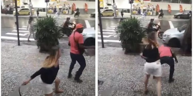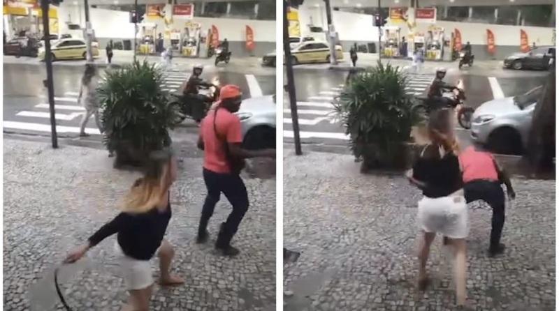 Nas imagens, ela usa a guia da coleira do cachorro para chicotear as costas do entregador. A vítima é moradora da Rocinha e contou na 15ª DP (Gávea), que um grupo de entregadores estava em frente à loja para a qual trabalham.