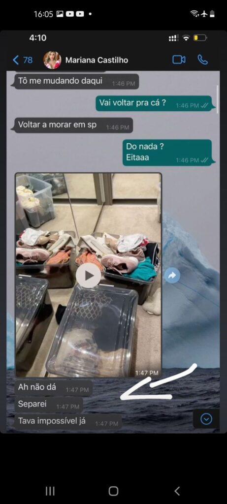 O jovem, porém, rebateu as acusações da bela com outra imagem. Em uma conversa divulgada por ele, Mariana afirma que está solteira e que ‘não aguentava mais’. Confira: