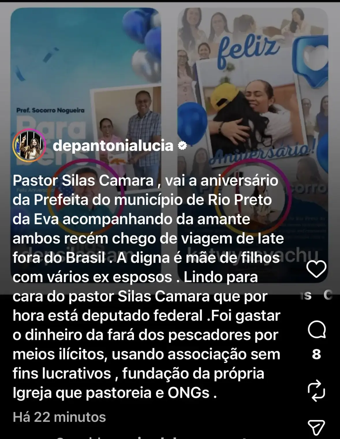 De acordo com Antônia, Silas Câmara foi ao aniversário da prefeita de Rio Preto da Eva com a amante, após passei romântico pelas águas. “Lindo para cara do pastor Silas Camara, que por hora está deputado federal. Foi gastar o dinheiro da Farra dos Pescadores por meios ilícitos, usando associação sem fins lucrativos, fundação da própria Igreja que pastoreia e ONGs”, declarou.