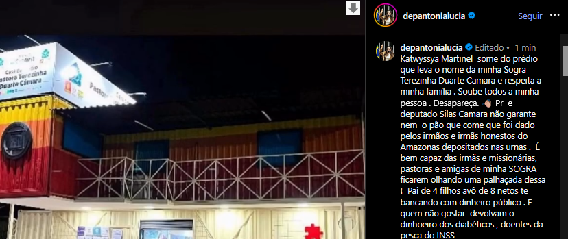 Na legenda, a parlamentar dirigiu críticas diretas à vereadora e a Silas, afirmando que o deputado “não garante nem o pão que come” e mencionando seu papel como pai e avô. As declarações reforçam a série de ataques públicos que Antônia Lúcia vem fazendo desde que tornou pública a separação.