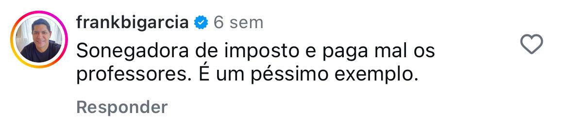 “Sonegadora de imposto e paga mal os professores. É um péssimo exemplo”, escreveu Bi Garcia na publicação. O ex-prefeito foi condenado a pagar R$ 15 mil, a título de compensação por danos morais.