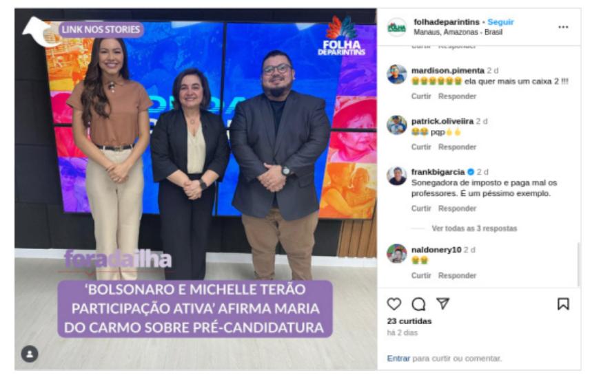 A ação movida pela equipe jurídica da Professora Maria do Carmo teve como objeto um comentário feito por Bi Garcia, no dia 3 de junho, em uma reportagem feita por um veículo de imprensa do interior do Estado, divulgando a participação do ex-presidente Jair Bolsonaro e sua esposa, Michelle Bolsonaro, nas eleições do ano que vem no Amazonas.
