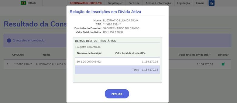 Não há especificações a respeito da origem da dívida do petista com a União. As cobranças ativas são aquelas já são reconhecidas judicialmente e que aguardam pelo pagamento dos devedores.