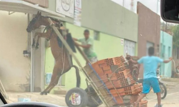 CEARÁ | Na manhã desta terça-feira (27), um burro foi fotografado ficando suspenso em uma carroça devido ao excesso de peso na carga em que ele transportava, em Juazeiro do Norte. O caso foi denunciado à polícia ambiental.