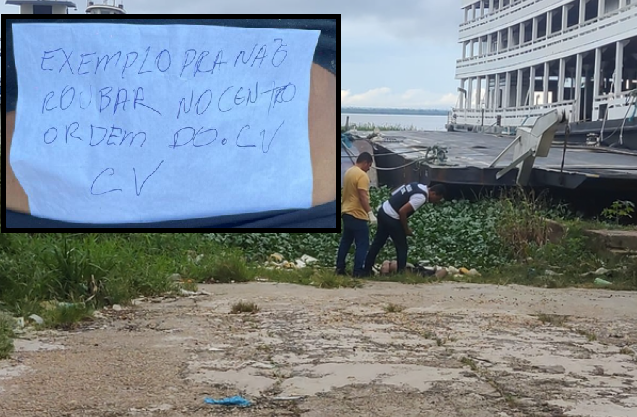 O homem não foi identificado, mas tinha um saco na cabeça e o bilhete: “Exemplo pra quem rouba no Centro”, com assinatura do CV.