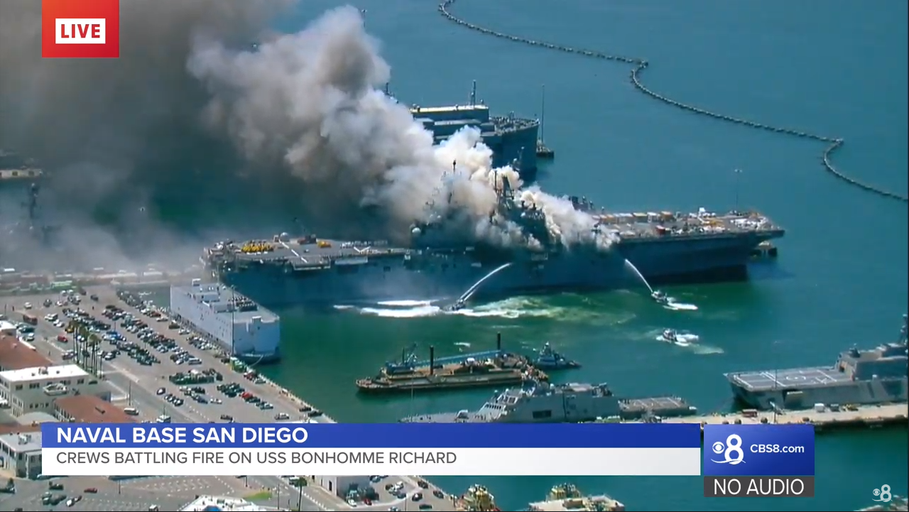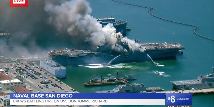 EUA | O navio USS Bonhomme Richard, na base naval de San Diego, na Califórnia (EUA), foi atingido por um incêndio de grandes proporções na tarde deste domingo (12).