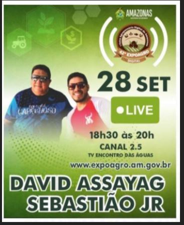MANAUS-AM | Buscando promover a cultura regional, a 1ª Feira Agropecuária Digital do Amazonas (42ª Expoagro) promete muito arrocha e boi-bumbá, por meio de lives nos três dias de evento, 28, 29 e 30 de setembro, ao som dos levantadores de toada, David Assayag e Sebastião Jr., e dos cantores John Veiga e Guto Lima.