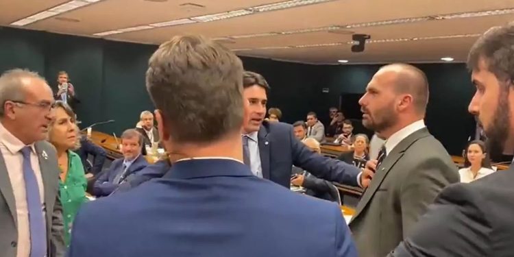 O filho de Bolsonaro se levantou do seu lugar e avançou em direção ao outro político, os outros deputados, que participavam da Comissão de Trabalho nesta quarta-feira (19), precisaram intervir.