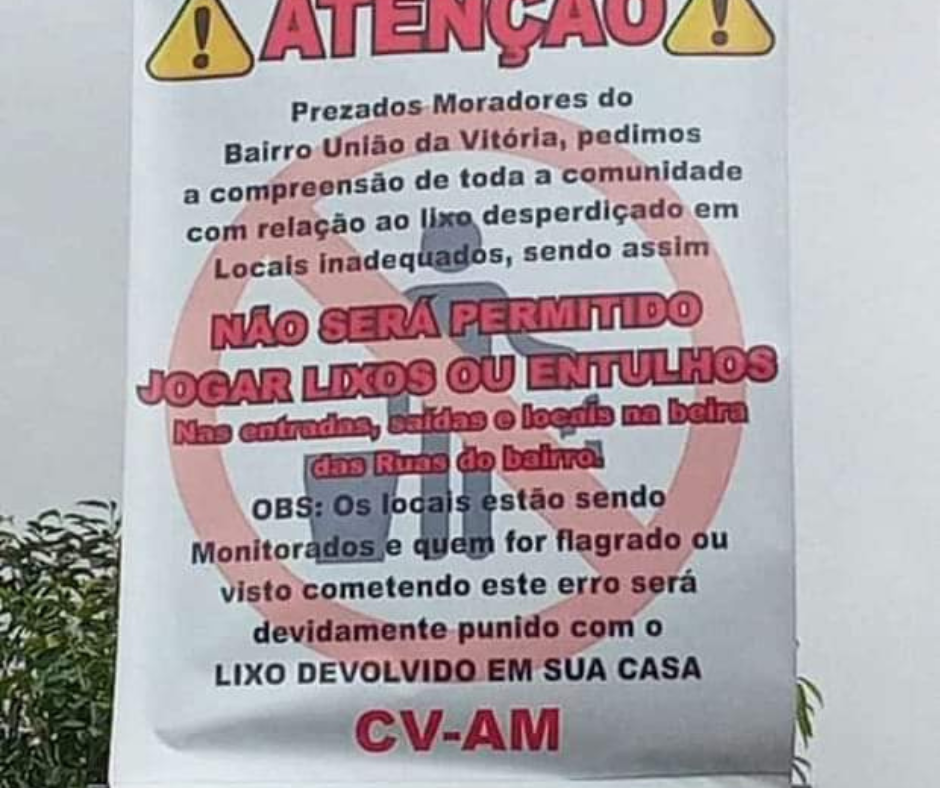 MANAUS (AM) – Um cartaz de proibição para jogar lixo na rua surpreendeu os moradores da comunidade União da Vitória, no bairro Tarumã, zona Oeste de Manaus, mas não é qualquer cartaz, é um cartaz com um recado da facção Comando Vermelho.