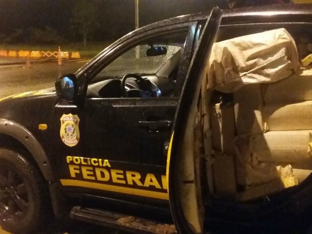 Na cabine e na carroceria da falsa viatura da PF foram encontrados 744 kg de maconha em tabletes armazenados em fardos, além de dois coletes à prova de bala semelhantes aos utilizados pela polícia.
