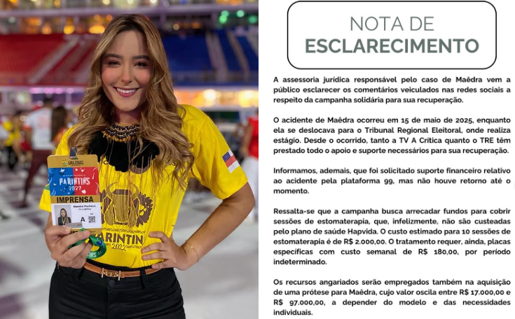 “Desde o ocorrido, tanto a TV A Crítica quanto o TRE têm prestado todo o apoio e suporte necessários para sua recuperação”, diz trecho da nota, que informa ainda que pediu suporte financeiro da plataforma 99, serviço de motociclista por aplicativo que Maêdra usou. “Não houve retorno até o momento”.