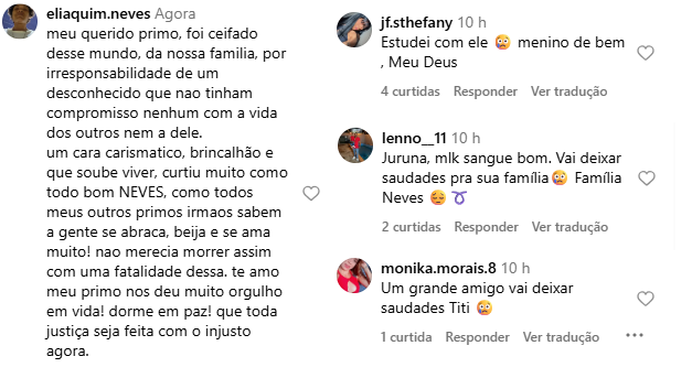 “Foi ceifado desse mundo, da nossa família, por irresponsabilidade de um desconhecido que não tinha compromisso nenhuma com a vida dos outros nem a dele”, disse o primo, Eliaquim Neves, numa postagem nas redes sociais, negando que Wilker conhecesse o motorista ou que tivesse se envolvido numa briga.