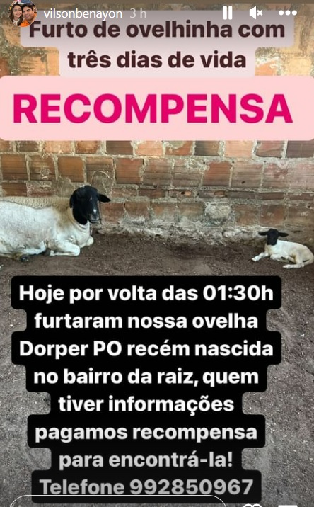 A ovelha é filha de campeões da Expoagro 2022 e tem apenas três dias de vida. “Ela pode morrer se ficar longe da mãe”, afirma o advogado. O ladrão pulou o muro do local e levou o animal. “Pagamos uma boa quantia”, ele diz, para quem conseguir ajudar.