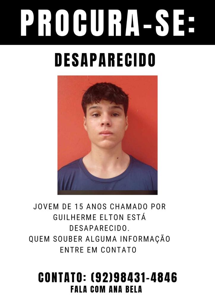 MANAUS (AM) – A família de Guilherme Elton pede ajuda para encontrar o adolescente de 15 anos que saiu de casa para se exercitar na Ponte Rio Negro, rua Coronel Cirilo Neves, bairro Compensa, zona Oeste de Manaus.
