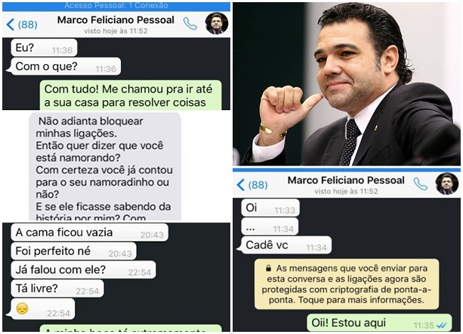 Após o episódio, a jovem o procurou pelo aplicativo WhatsApp e teriam trocado mensagens que comprovariam o ocorrido (veja abaixo). O colunista destaca que ela foi obrigada pelo próprio parlamentar a apagar toda a conversa, mas, pelo iCloud, conseguiu recuperar os dados. Mazzini ressalta ainda que o número do telefone que aparece nas mensagens foi confirmado por funcionários do PSC como sendo o pessoal de Feliciano.