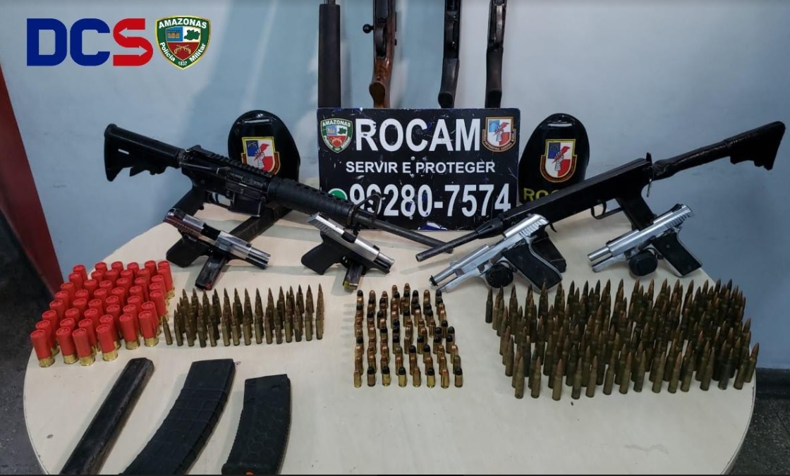 MANAUS – AM | Equipe das Rondas Ostensivas Cândido Mariano (Rocam) capturou, nesta quarta-feira (31/03), um foragido da justiça e apreendeu várias armas de fogo, placas balísticas e munições de diversos calibres na zona Leste. A ação foi por volta das 15h30, durante patrulhamento, quando os policiais na viatura 2332 receberam uma denúncia via WhatsApp Rocam, que na rua 06, bairro Jorge Teixeira, havia um foragido do município de Coari.