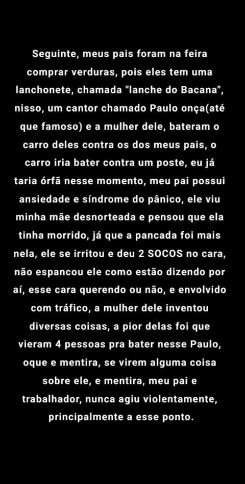 “Seguinte, meus pais foram na feira comprar verduras, pois eles tem uma lanchonete, chamada ‘Lanche de Bacana”, nisso, um cantor chamado Paulo onça(até que famoso) e a mulher dele, bateram o carro deles contra os dos meus pais, o carro iria bater contra um poste, eu já taria órfã nesse momento, meu pai possui ansiedade e síndrome do pânico, ele viu minha mãe desnorteada e pensou que ela tinha morrido, já que a pancada foi mais nela, ele se irritou e deu 2 SOCOS no cara, não espancou ele como estão dizendo por aí, esse cara querendo ou não, e envolvido com tráfico, a mulher dele inventou diversas coisas, a pior delas foi que vieram 4 pessoas pra bater nesse Paulo, oque e mentira, se virem alguma coisa sobre ele, e mentira, meu pai e trabalhador, nunca agiu violentamente, principalmente a esse ponto.”.