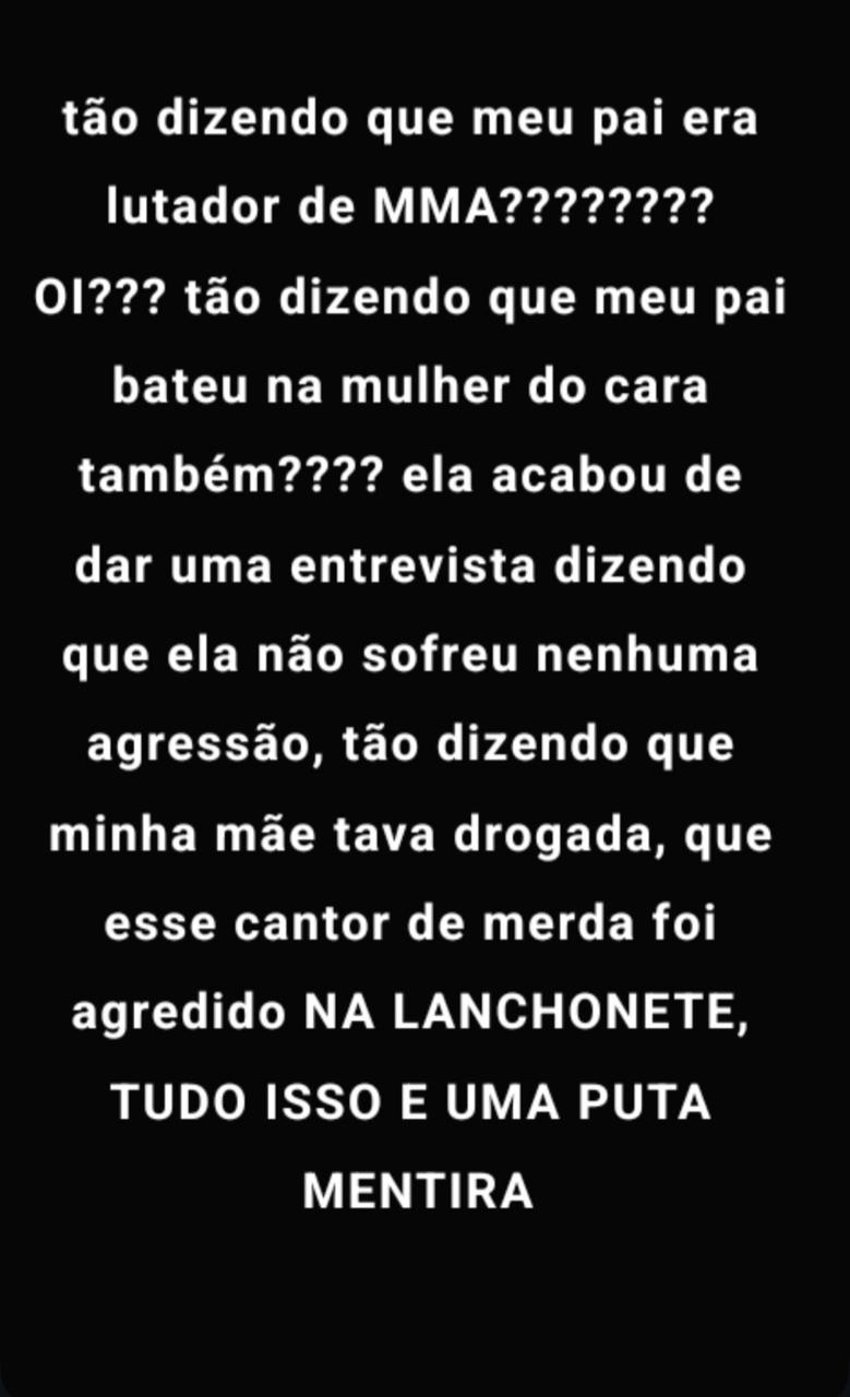 “tão dizendo que meu pai era lutador de MMA???????? OI??? tão dizendo que meu pai bateu na mulher do cara também???? ela acabou de dar uma entrevista dizendo que ela não sofreu nenhuma agressão, tão dizendo que minha mãe tava drogada, que esse cantor de merda foi agredido NA LANCHONETE, TUDO ISSO É UMA PUTA MENTIRA”.