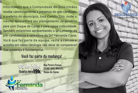 “Informamos que a comunidade do Dois Irmãos recebe carinhosamente a presença do pré-candidato a prefeito do município, José Camilo Zito, onde o mesmo apresentará seu planejamento de governo para Duque de Caxias e para nossa comunidade. Também estaremos apresentando o pré-lançamento da pré-candidatura à vereadora da Dra. Fernanda Costa. Você que faz parte da equipe, veste a acamisa e acredita em nossa ideologia não deixe de comparecer. Sua presença é fundamental”, escreveu na publicação.