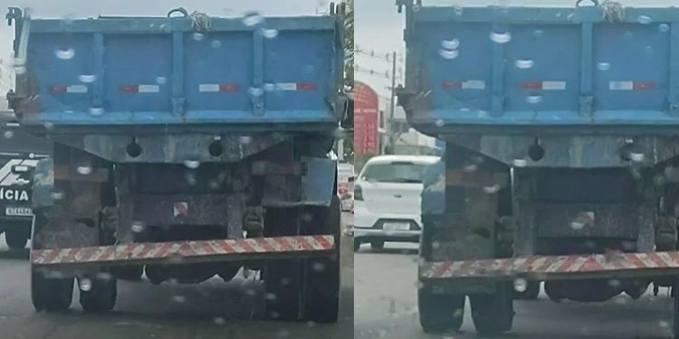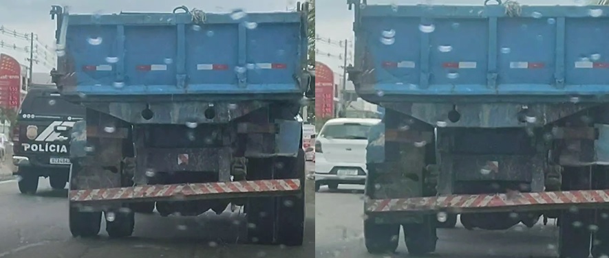 Além disso o caminhão não tem placa e o para-choque está quase caindo, deixando claro que o veículo pesado é uma sucata ambulante prestes a causar um acidente.