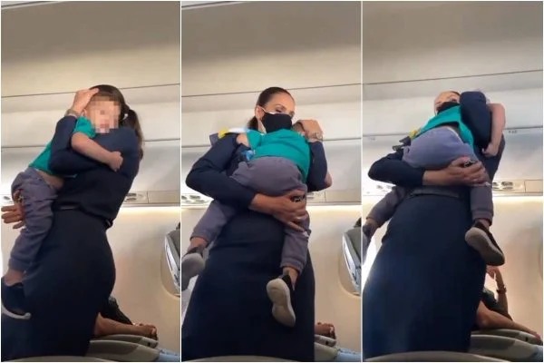 Um passageiro registrou o momento em que a funcionária acalmava uma criança, num gesto de muita empatia (veja o vídeo abaixo). Segundo o homem, identificado como Raphael Aquilles, a criança estava com o pai e chorava muito, até que a comissária de bordo veio a primeira vez até ele e trouxe adesivos para ele brincar, mas isso não surtiu efeito.