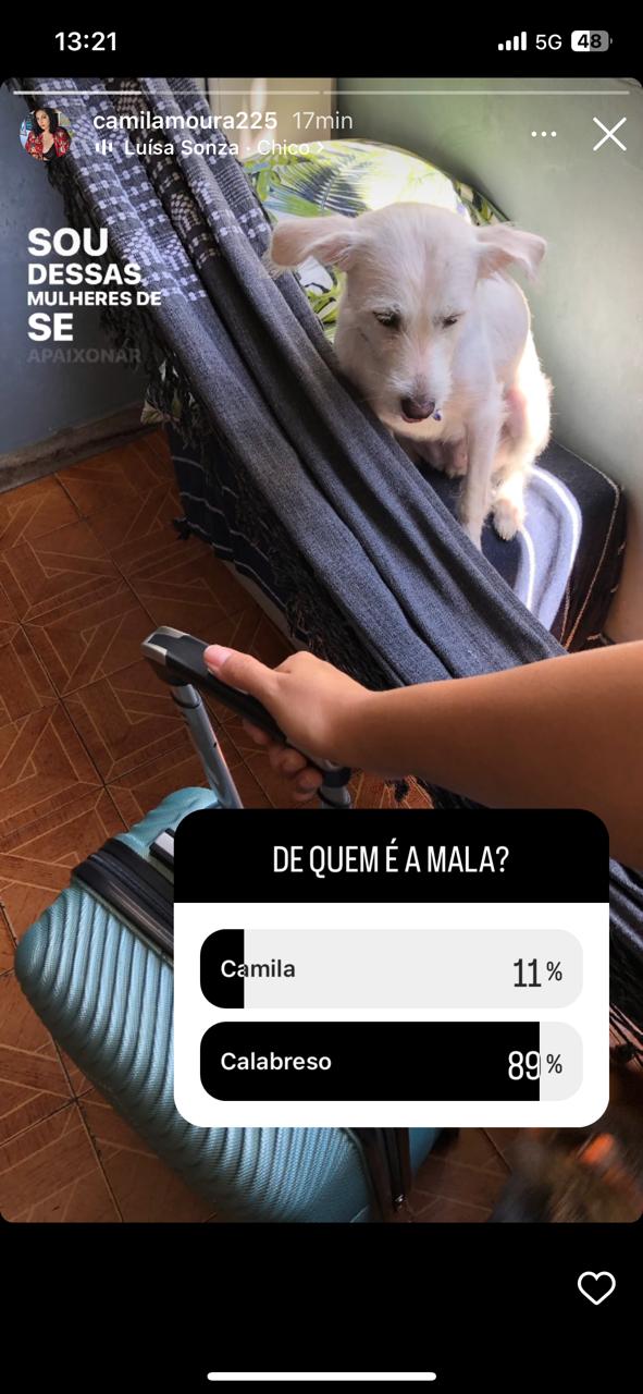 No stories, ela fez uma publicação com a música “Chico”, que fala sobre a traição sofrida por Luísa Sonza. A foto tem uma mala e ela questionou o público se o objeto era dela ou do “Calabreso”, forma que o público se refere a Lucas desde a briga com Davi.
