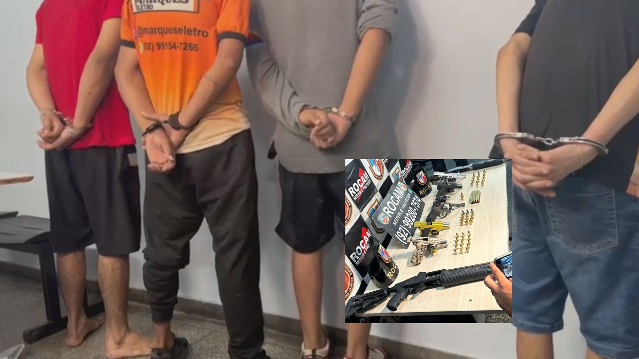 MANAUS (AM) – Na noite desta quinta-feira (14), a polícia realizou uma série de prisões e apreensões relacionadas ao foguetório que chamou atenção em diversos bairros de Manaus. Durante operações coordenadas em áreas de maior movimentação de facções, quatro homens foram detidos no bairro Nossa Senhora de Fátima, com um arsenal de armas e munições. Entre os itens apreendidos estavam duas espingardas de grosso calibre, além de pistolas e foguetes.